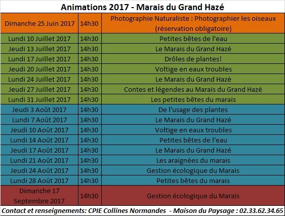 De nombreuses animations sont proposées au Marais du Grand Hazé pour vous permettre de découvrir les richesses culturelles, historiques et naturelles du site. Le Conseil Départemental de l'Orne a missionné le CPIE des Collines normandes pour réaliser des sorties nature aux thématiques variées et ainsi permettre au plus grand nombre d'aborder la faune et la flore du site, la gestion écologique, l'entretien par les chevaux Camarguais et les vaches Ecossaises, l'histoire et l'utilisation passée du marais par les hommes...